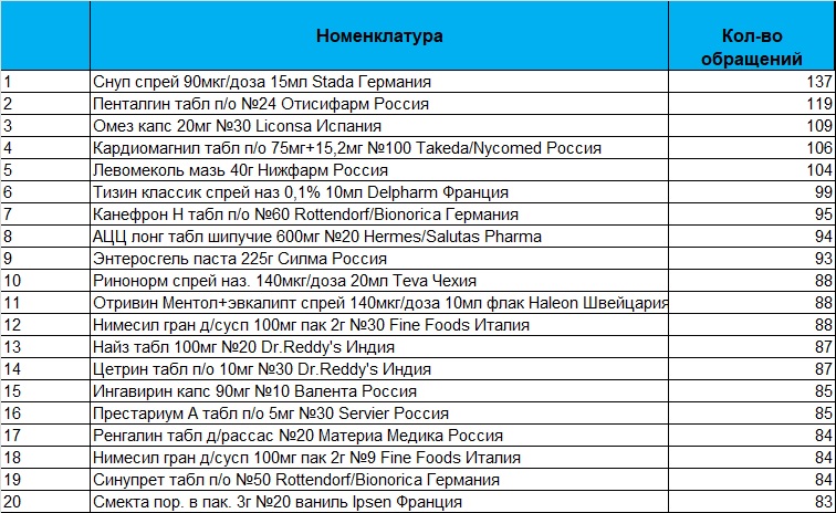 20 топ-позиций аптечного ассортимента, наиболее востребованных при аптечных заказах через торговую площадку (по обращаемости) по региону СПб и ЛО. Период 06 - 12 октября 2025г
