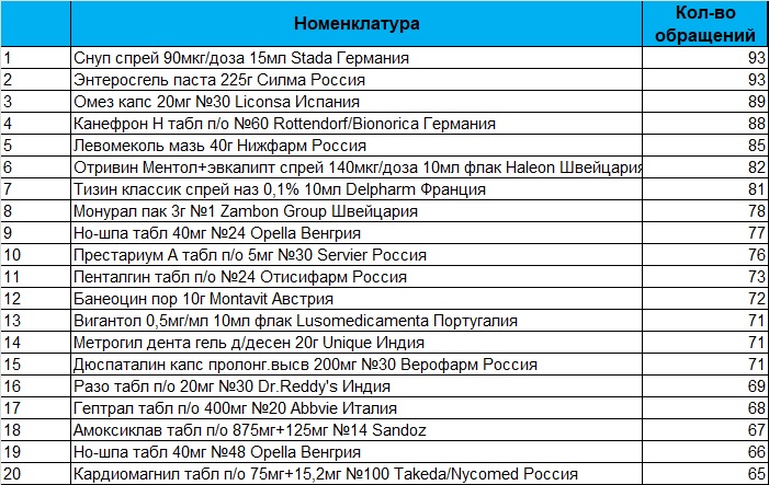 20 топ-позиций аптечного ассортимента, наиболее востребованных при аптечных заказах через торговую площадку (по обращаемости) по региону СПб и ЛО. Период 03 - 09 ноября 2025г
