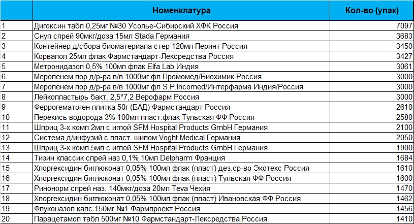 20 топ-позиций аптечного ассортимента, наиболее востребованных при аптечных заказах через торговую площадку (кол-во, уп.) по региону СПб и ЛО. Период 17 - 23 ноября 2025г