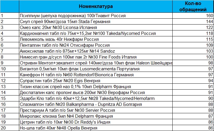 20 топ-позиций аптечного ассортимента, наиболее востребованных при аптечных заказах через торговую площадку (по обращаемости) по региону СПб и ЛО. Период 17 - 23 ноября 2025г