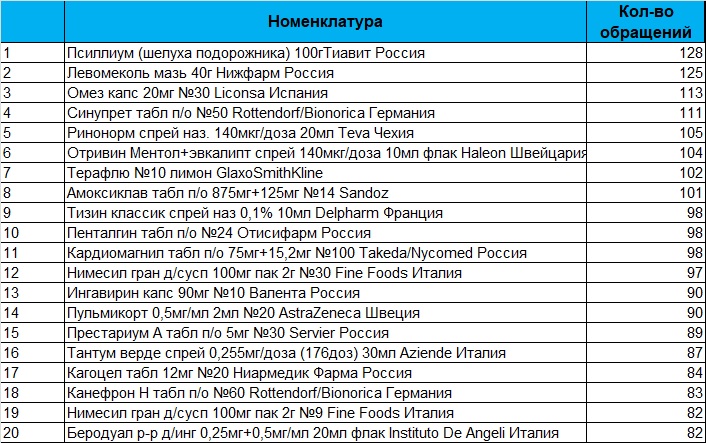 20 топ-позиций аптечного ассортимента, наиболее востребованных при аптечных заказах через торговую площадку (по обращаемости) по региону СПб и ЛО. Период 09 - 15 февраля 2026г
