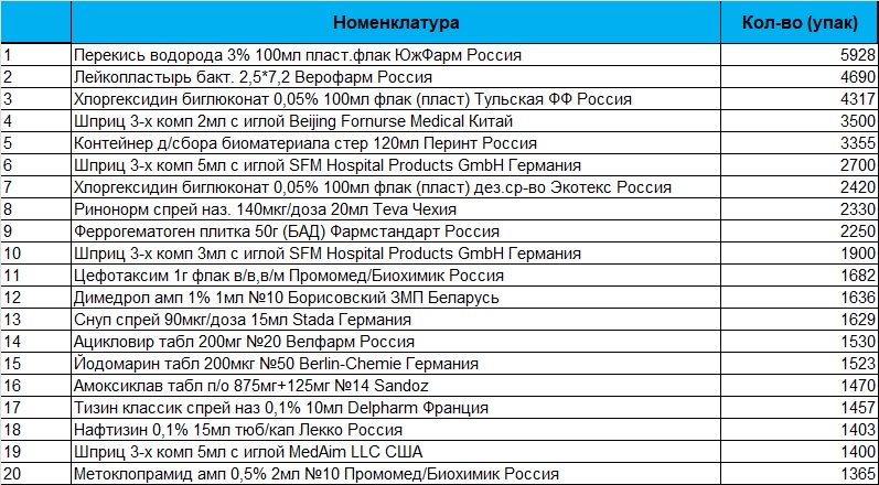20 топ-позиций аптечного ассортимента, наиболее востребованных при аптечных заказах через торговую площадку (кол-во, уп.) по региону СПб и ЛО. Период 30 марта - 05 апреля 2026г