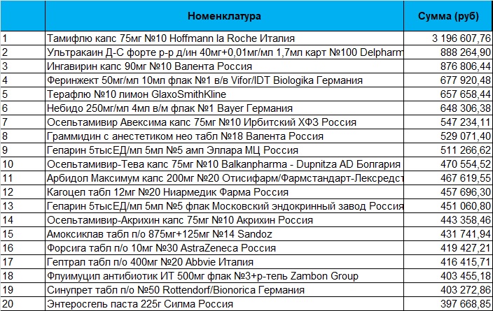 20 топ-позиций из 2367, обеспечивших 80% аптечных заказов торговой площадки по сумме продаж (руб) по региону СПб и ЛО. Период 22 - 28 декабря 2025г