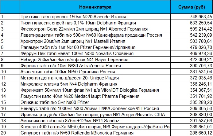 20 топ-позиций из 2575, обеспечивших 80% аптечных заказов торговой площадки по сумме продаж (руб) по региону СПб и ЛО. Период 23 - 29 марта 2026г