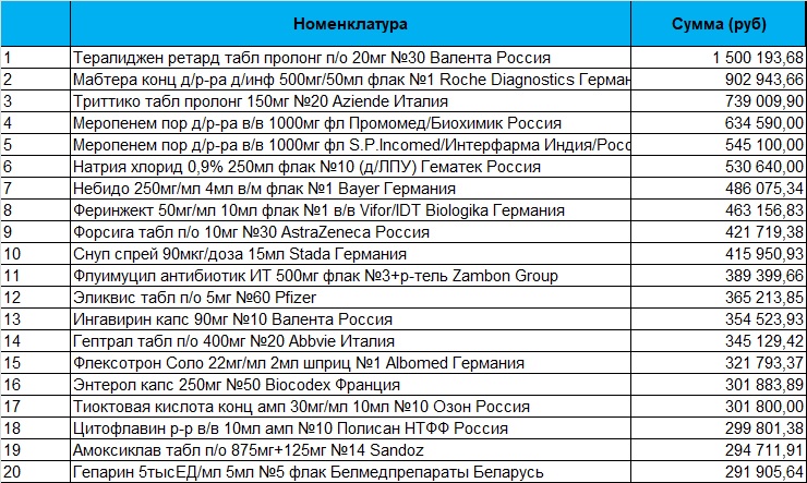 20 топ-позиций из 2697, обеспечивших 80% аптечных заказов торговой площадки по сумме продаж (руб) по региону СПб и ЛО. Период 17 - 23 ноября 2025г