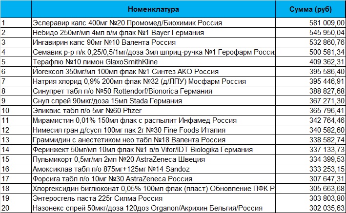 20 топ-позиций из 2788, обеспечивших 80% аптечных заказов торговой площадки по сумме продаж (руб) по региону СПб и ЛО. Период 29 сентября - 05 октября 2025г