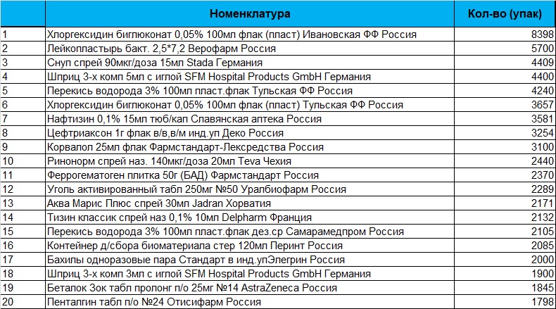 20 топ-позиций аптечного ассортимента, наиболее востребованных при аптечных заказах через торговую площадку (кол-во, уп.) по региону СПб и ЛО. Период 21 - 27 апреля 2025г