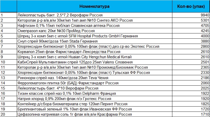 20 топ-позиций аптечного ассортимента, наиболее востребованных при аптечных заказах через торговую площадку (кол-во, уп.) по региону СПб и ЛО. Период 20 - 26 октября 2025г