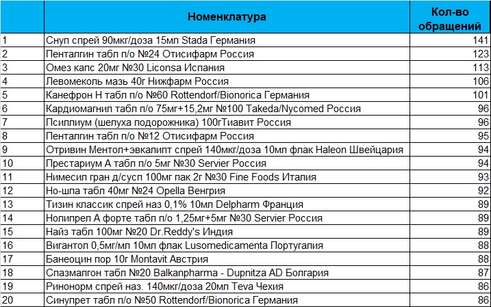 20 топ-позиций аптечного ассортимента, наиболее востребованных при аптечных заказах через торговую площадку (по обращаемости) по региону СПб и ЛО. Период 20 - 26 октября 2025г