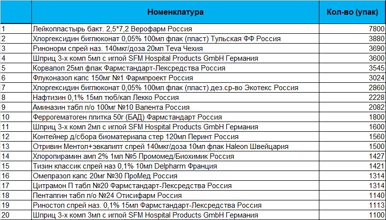 20 топ-позиций аптечного ассортимента, наиболее востребованных при аптечных заказах через торговую площадку (кол-во, уп.) по региону СПб и ЛО. Период 12 - 18 января 2026г