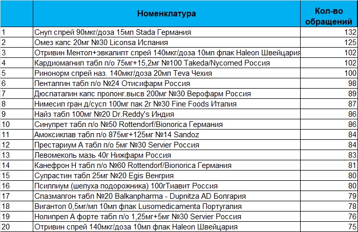 20 топ-позиций аптечного ассортимента, наиболее востребованных при аптечных заказах через торговую площадку (по обращаемости) по региону СПб и ЛО. Период 19 - 25 января 2026г