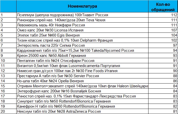 20 топ-позиций аптечного ассортимента, наиболее востребованных при аптечных заказах через торговую площадку (по обращаемости) по региону СПб и ЛО. Период 26 января - 01 февраля 2026г
