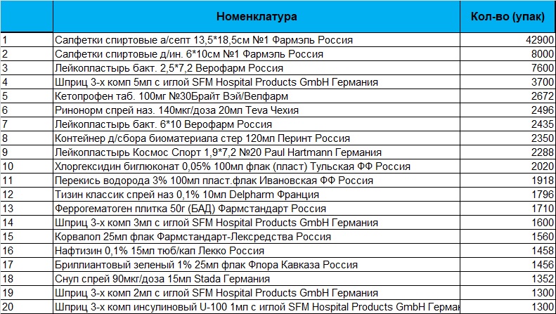 20 топ-позиций аптечного ассортимента, наиболее востребованных при аптечных заказах через торговую площадку (кол-во, уп.) по региону СПб и ЛО. Период 16 - 22 марта 2026г